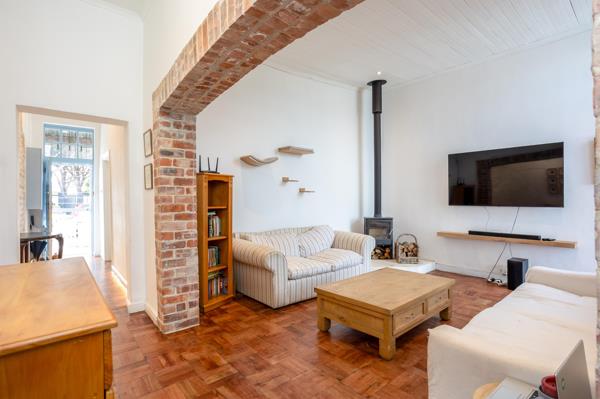 Further down the corridor, we have a spacious separate lounge area with a newly installed steel fireplace with inter-leading doors to the back courtyard. The ceiling has wooden ceiling panels and an exposed brick wall arch feature.