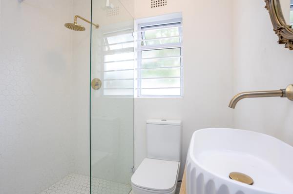 On your left, there is the main spacious bedroom with high ceilings, built in seating alongside aluminium windows, built in cupboards, with an ensuite bathroom with tile features, ceramic basin and shower. Additional feature is the modern matte black fittings.