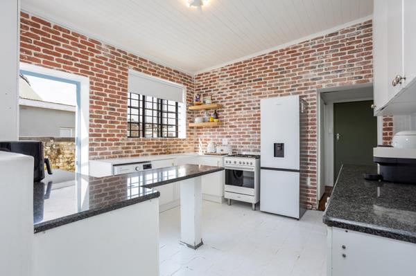 The kitchen has a multi purpose dinning-room area with a custom-built dining bench for added seating and storage. The kitchen has granite countertops with a gas stove. Ample cabinets and cupboards with a plumbing point. The kitchen has a back door leading onto a side alleyway and garden.