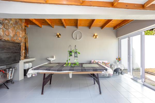 Lounge and dining set cleverly behind the kitchen for those with the desire to open plan the house all the way out to the sparkling blue pool and built in braai entertainment space. Bonus of an outside loo. Fantastic stacker aluminium doors too for maximum indoor outdoor living.