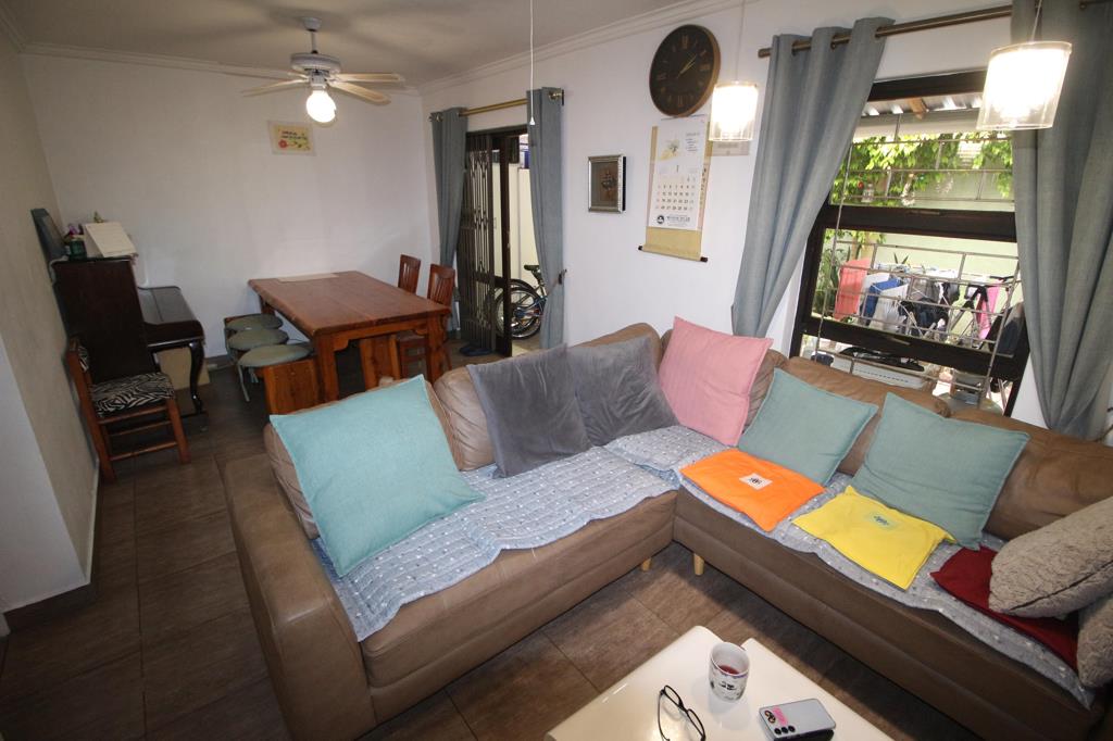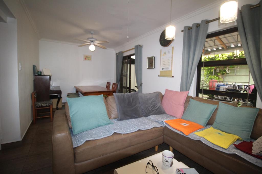 The home features a warm and welcoming lounge with space for a dining area, creating a cosy yet practical living environment. A sliding door fitted with a security gate opens onto an intimate backyard, perfect for outdoor relaxation or light gardening.