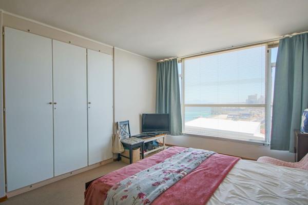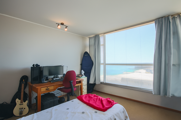 The main bedroom is generously sized and filled with natural light, featuring panoramic views of the sea and beachfront, along with an en-suite bathroom complete with a bath-and-shower combo.