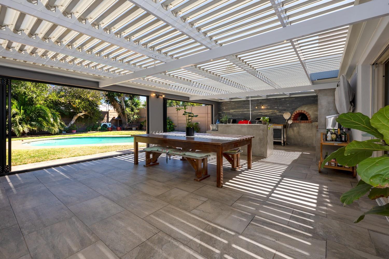 At the heart of the home is a massive 49sqm enclosed braai and entertainment room, making this property a true entertainers delight. This impressive space boasts adjustable louvres, stacker doors, a built-in braai, pizza oven, and a built-in bar with bar fridge, seamlessly opening onto a private, expansive garden and sparkling swimming poolperfect for hosting all year round.