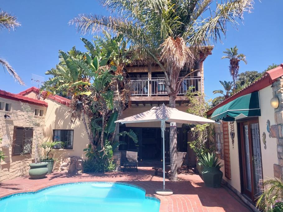 Unique family home set on a large plot with lush garden, fish pond and large swimming pool. Entertainers dream with large indoor and outdoor braai, fireplace for the winter months and a man-cave. Downstairs are 4 bedrooms with open-plan dining/lounge area which flows to the swimming pool and inner court yard. The main ensuite bedroom has a sliding door to the swimming pool and a door at the back leads to an enclosed garden/boma area. Good security with trellidor and spanish burglar bars in front of all windows and sliding doors. Upstairs are a large open-plan lounge/study area and a sunny bedroom with sliding door which opens to a pergola/sitting area overlooking the swimming pool. A bonus is a 1 bedroom flatlet with private entrance and which is separate from the main house (rental income: R 6000/month). There are 2 boreholes with ample supply of water (no discoloration of walls/ swimming pool).
