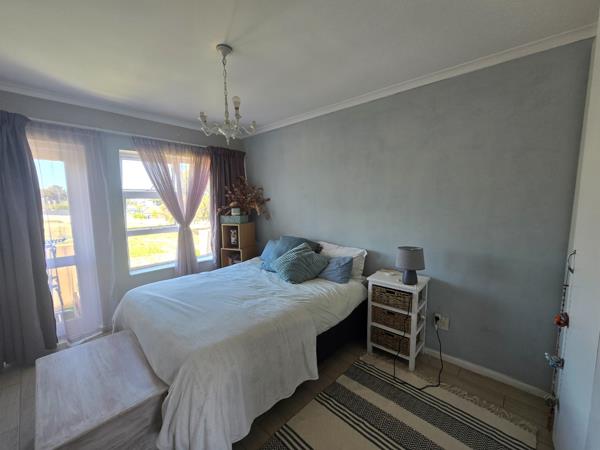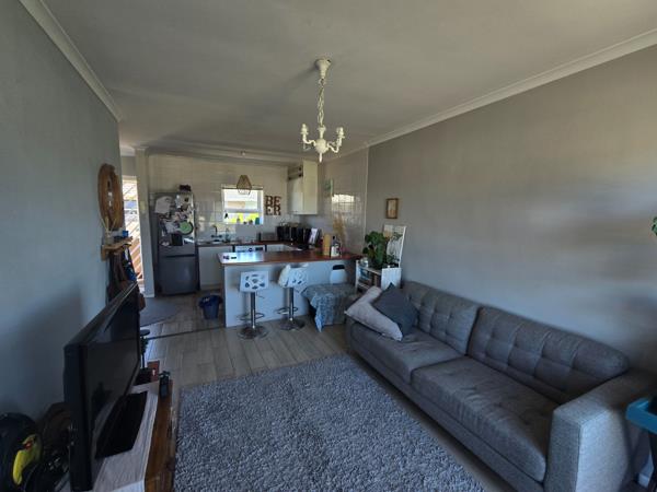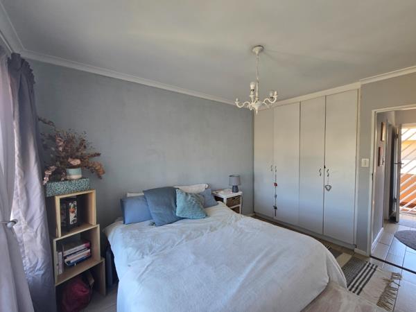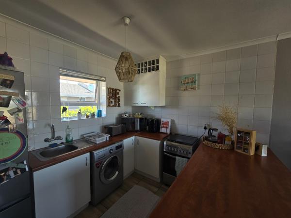 Spacious tiled living area with sliding door opening up onto a lovely balcony, with views towards Durbanville Hills. The open plan kitchen is well fitted, and offers a gas stove, as well as plumbing for a washing machine.