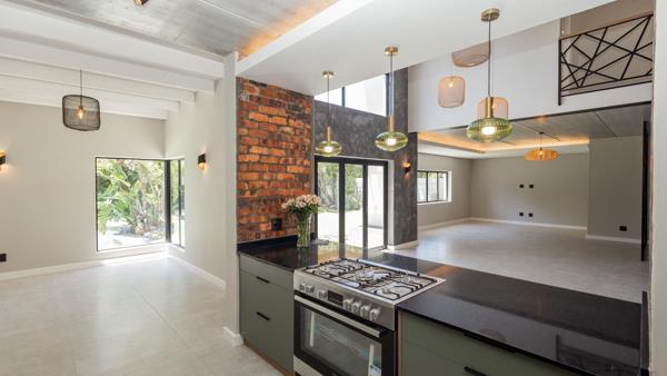 A sumptuous kitchen dressed in hues of olive and naturals with attractive splash back tiling, raw brick finish, pendants over headunder counter lighting, a host of beautiful self closing cabinetry designed with thought and care, prep bowl, nestling within the island counter a Beko five plate gas hobelec oven, scullery with double wash troughs, plumbed for two plus an outdoor drying courtyard - the entertainment areas have a seamless flow, lounge to dining to kitchen to braai room with built in braai and feature wine store.