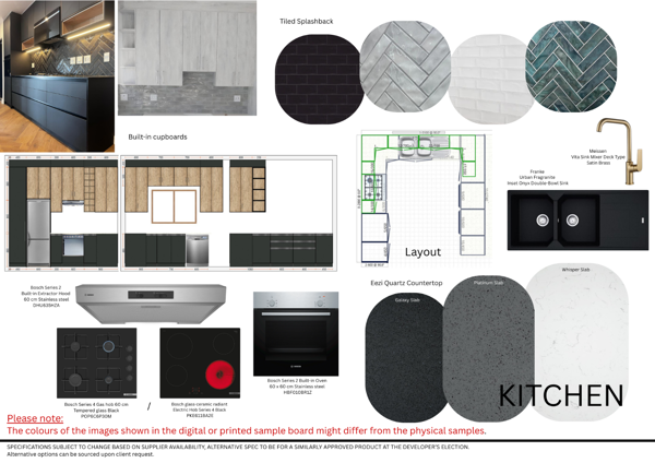 The kitchen will offer a range of top andamp bottom built-in cupboards, finished in grey, with tiled splashback and stone countertops. Gas or glass hob, with Bosch built-in oven.