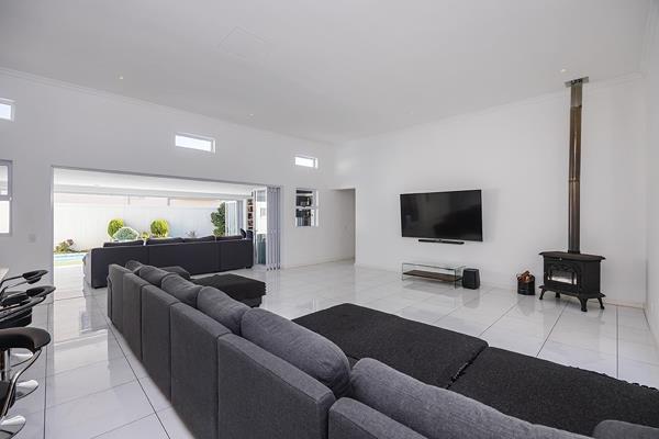 The adjoining living room is both vast and inviting, boasting extra-high ceilings and a striking wood-burning fireplace ideal for cozy winter evenings. For the ultimate in indoor-outdoor entertaining, the custom-designed entertainment lounge is nothing short of spectacular, offering a built-in pizza oven, braai, and bar area. Expansive stacker doors open effortlessly to reveal a sparkling lap pool with an automatic cover, all set against a backdrop of beautifully landscaped gardens.