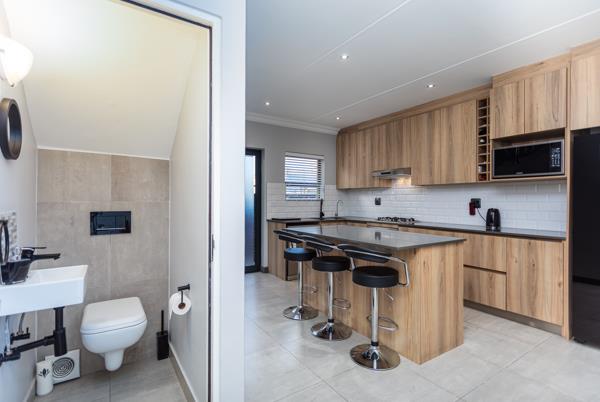 The open-plan living area boasts a beautifully designed, fully fitted kitchen with a gas hob, flowing seamlessly into the lounge and dining spaceperfect for effortless entertaining. An indoor braai area enhances the appeal for year-round gatherings. A guest bathroom is conveniently situated on the ground floor.
