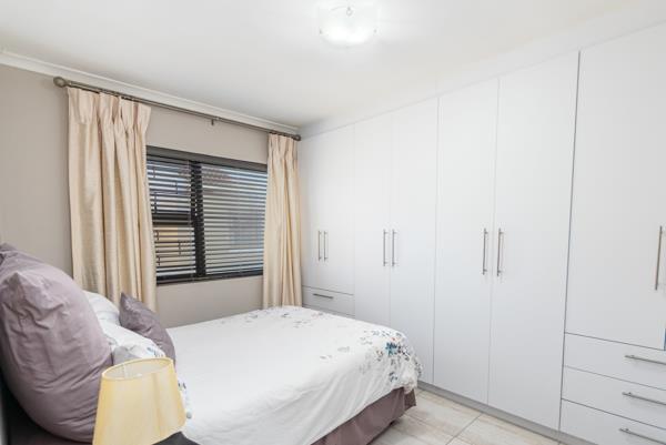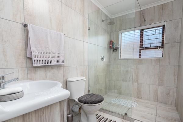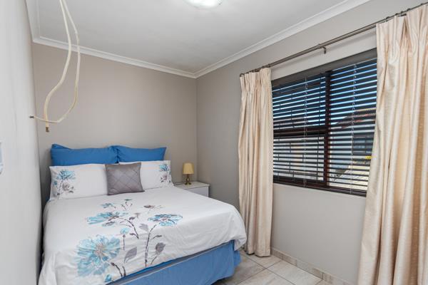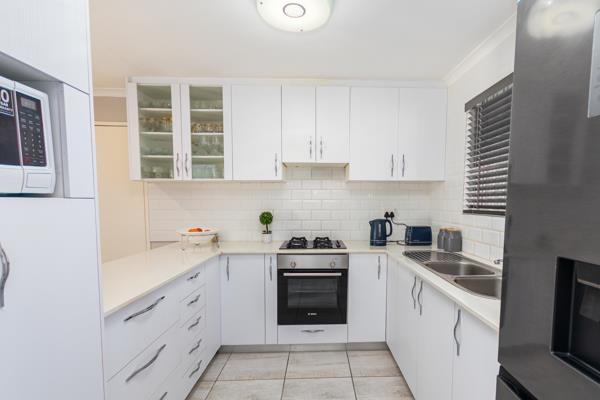 The home offers a bright open-plan living area and a well-kept kitchen with lots of cupboard space. All three bedrooms are tiled with built-in cupboards, and the main bathroom has a modern shower. There is also a separate guest toilet for extra convenience.