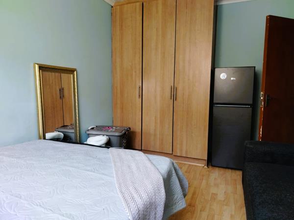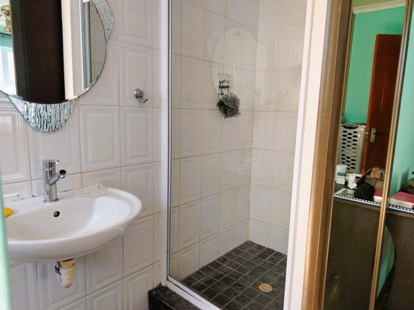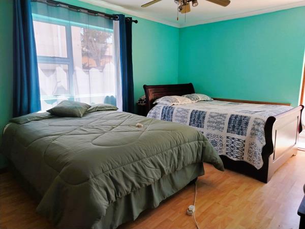 The home offers four spacious bedrooms, all with built-in cupboards and laminate flooring. The main bedroom includes a ceiling fan, an en-suite bathroom with a shower, toilet, and basin, and direct access to the backyard. The family bathroom features a bath, shower, basin, and toilet.