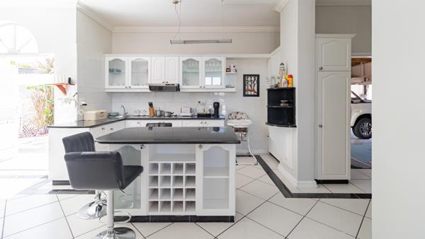 The spacious open-plan living area flows effortlessly to a private outdoor entertainment space featuring a built-in braai, bar area, and splash pool ideal for relaxed weekends and gatherings with friends. The kitchen is neat and well-designed, complete with a centre island and separate scullery.