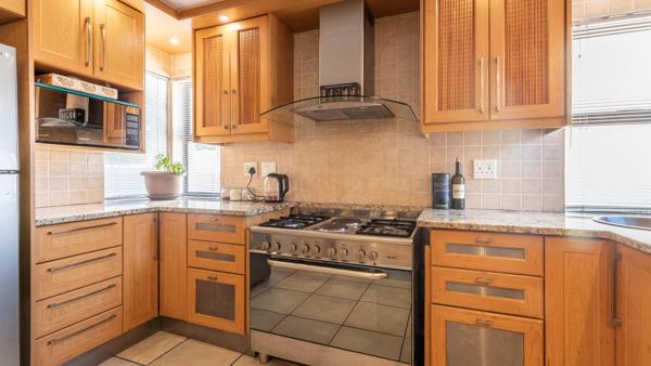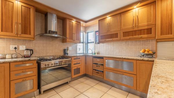The open-plan kitchen is spacious and functional, featuring ample cupboards, high-quality finishes, and a separate scullery with space for three appliances.