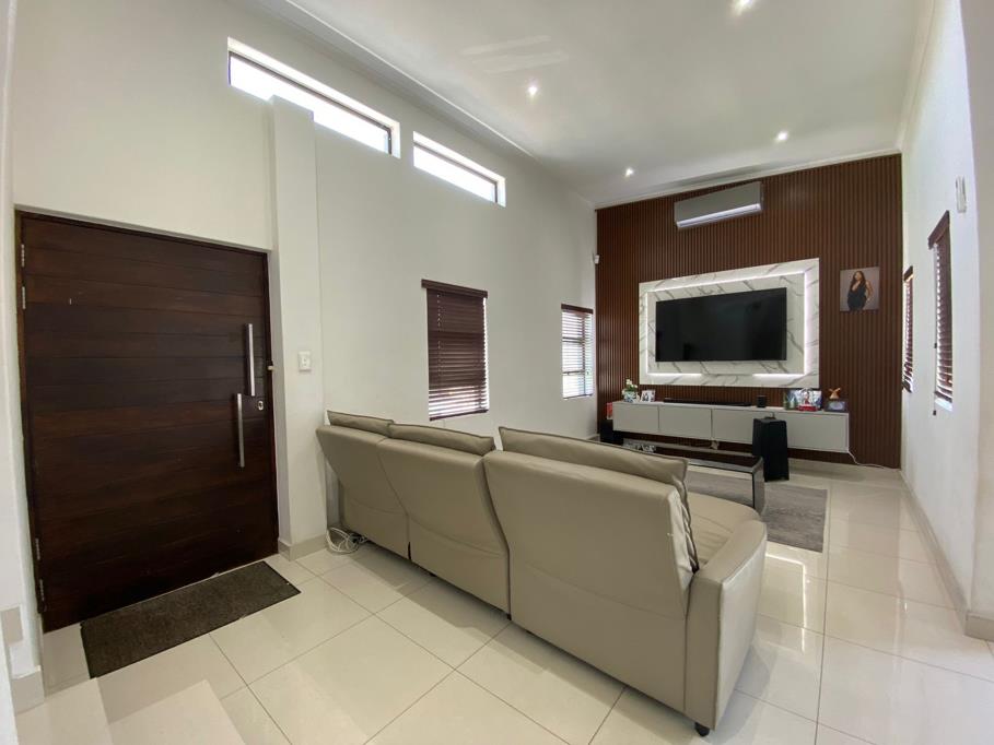 Additional features include a large tiled double garage with shelving, cupboard space, and an automated door, plus extra parking in front. The home is secured with an internal alarm system, exterior perimeter beams, and an electric fence along the boundary wall for complete peace of mind.