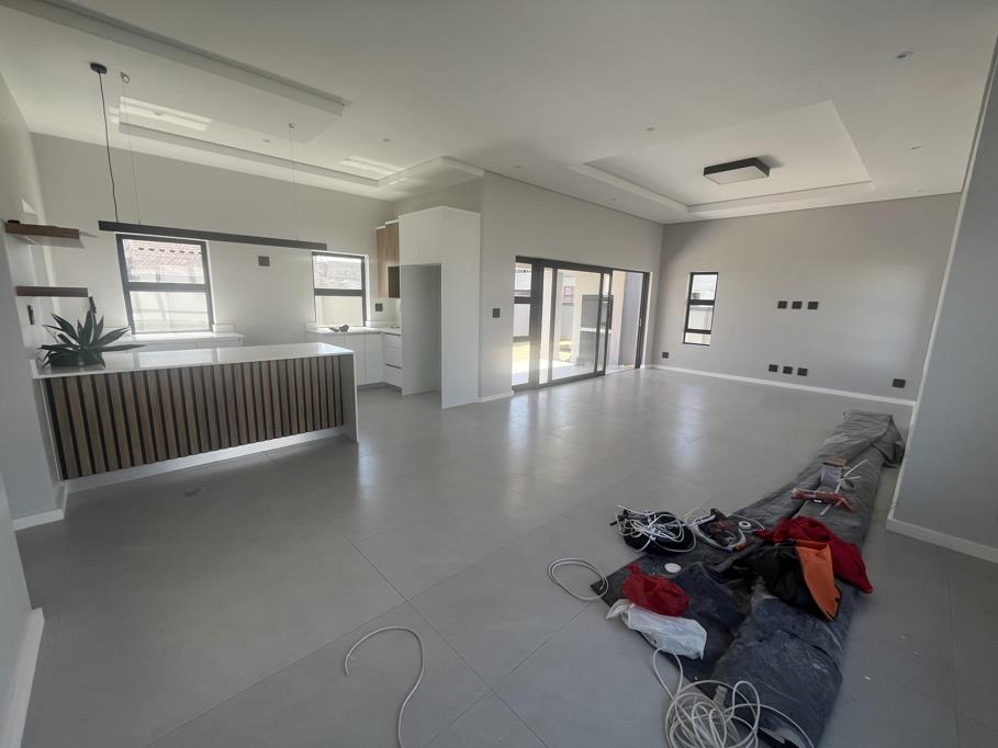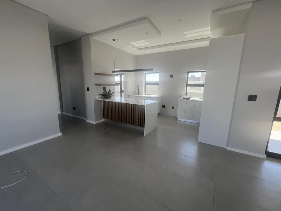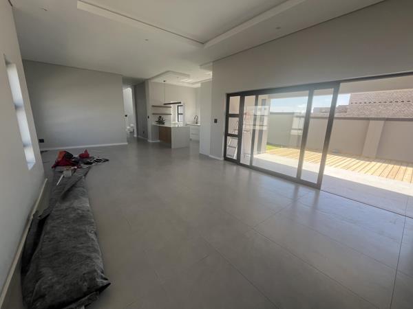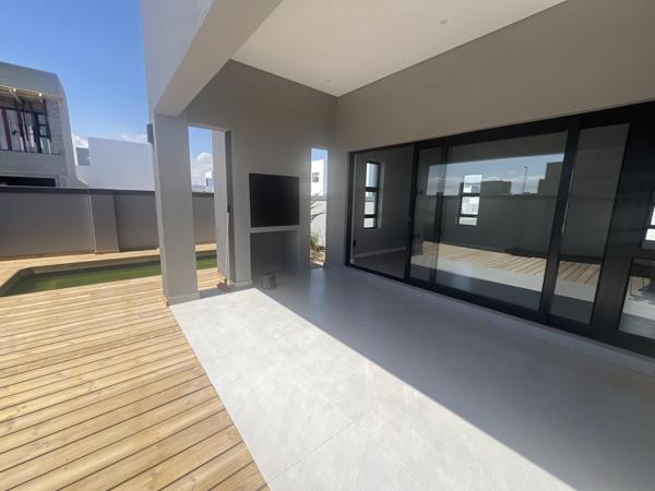 The sleek, state-of-the-art kitchen is a true showpiece, featuring a spacious island ideal for entertaining or relaxed meals. Flowing seamlessly into the open-plan living area and outdoor spaces, the home extends onto a chic wooden deck, complete with an infinity pool and a covered braai areaperfect for hosting in any season.