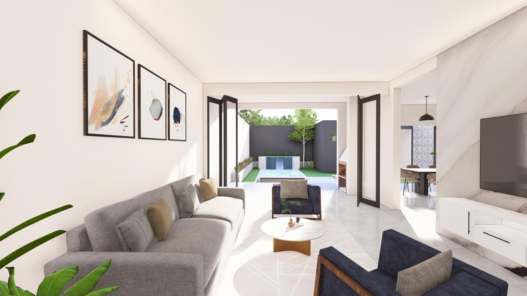 The open-plan dining room and designer kitchen command attention, overlooking the pool area and infused with effortless elegance. Downstairs, a spacious bedroom with en-suite shower adds to the allure.
