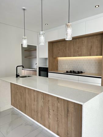 The home features a modern kitchen with scullery, flowing seamlessly into the dining and living area. Large sliding doors open to a private garden and entertainment patio, ideal for family gatherings and weekend braais.