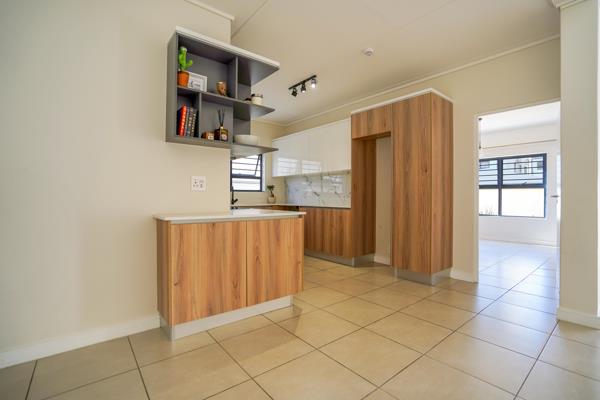 Step inside to a bright open-plan layout where your kitchen, dining and living areas flow seamlessly to a private patio the ideal spot for your morning coffee or relaxed weekend braais. The contemporary kitchen features engineered stone countertops, ample storage, an undercounter oven with hob & extractor, and is equipped for all your essential appliances.