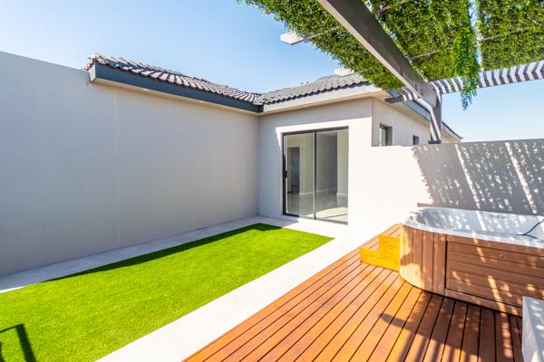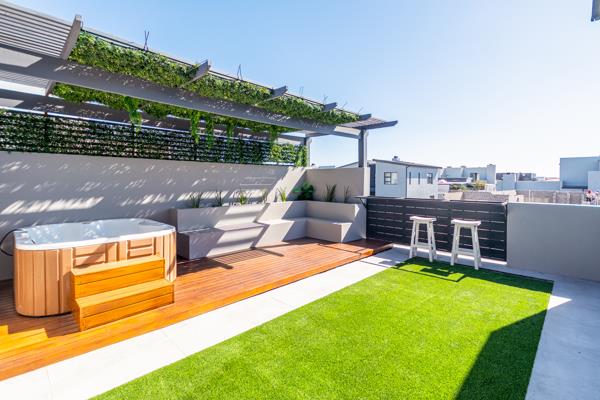 At the heart of the home, the chefs kitchencomplete with a pantry and sculleryflows effortlessly into spacious open-plan living areas, anchored by a cozy gas fireplace. Whether hosting guests or unwinding after a long day, the transition between indoor and outdoor spaces is flawless. Step onto the covered patio, where a built-in braai awaits, or elevate your evenings on the rooftop deck, complete with a Jacuzzi under the stars.