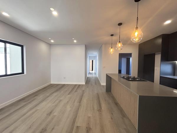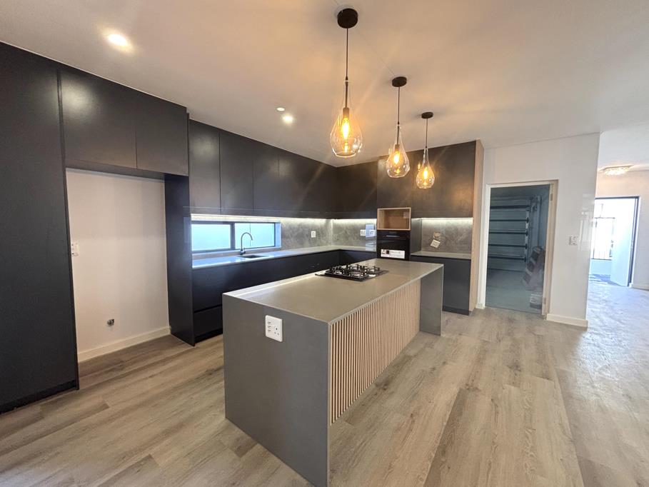 The open-plan living area creates a seamless flow, perfect for both entertaining and everyday living. The heart of the home is the stunning kitchen, complete with a large centre island, high-end feature light fittings, built-in appliances and a separate scullery for added convenience. Whether youre cooking for a family dinner or hosting friends, this kitchen will be a true delight.