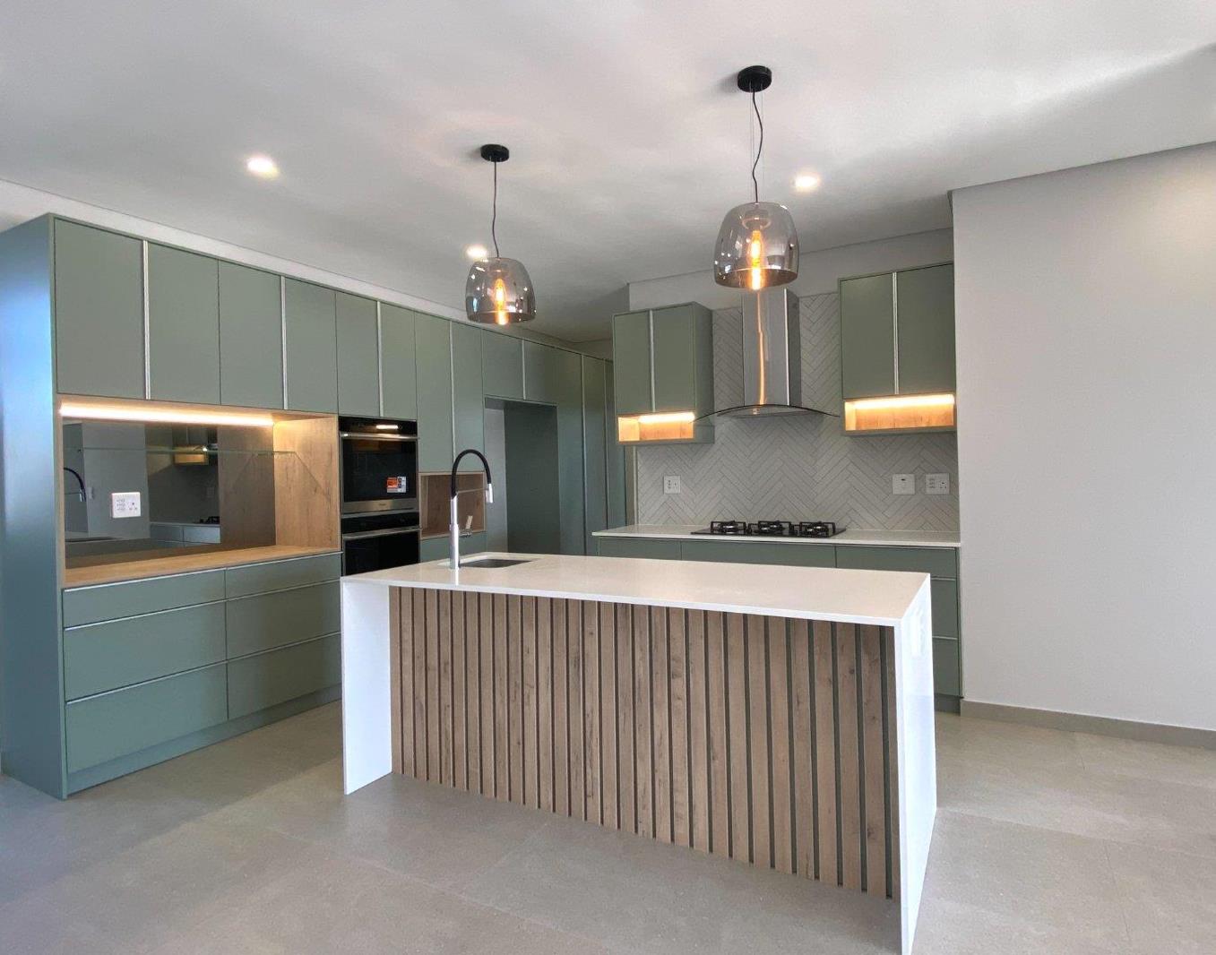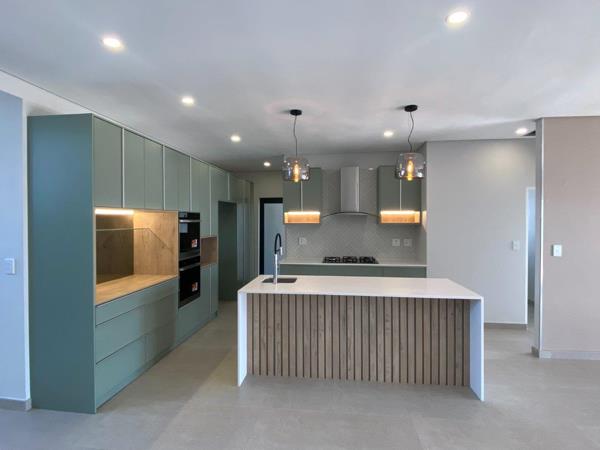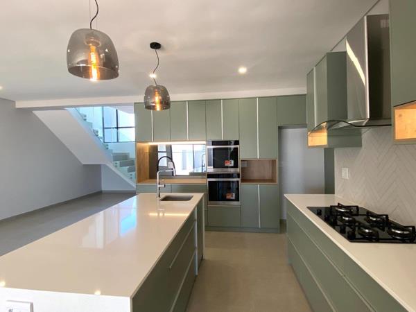 The modern open plan kitchen and scullery is fitted with engineered stone counter tops and lots of built in cupboards as well as a beautifully designed kitchen island, 2 eye level ovens and the scullery is plumbed for 2 appliances as well.