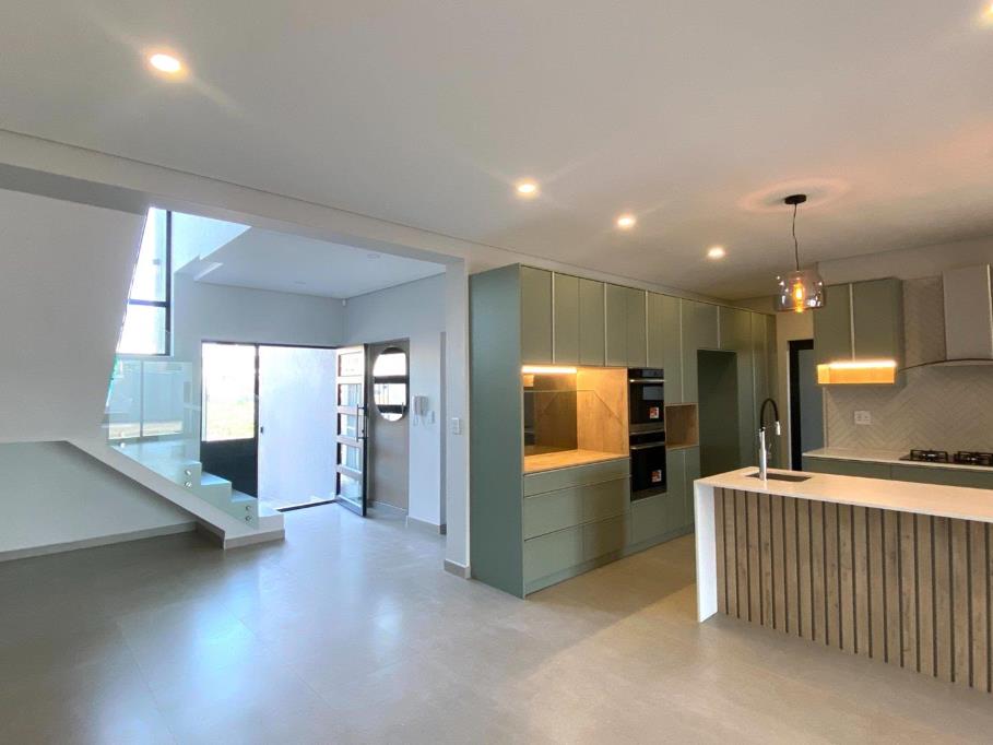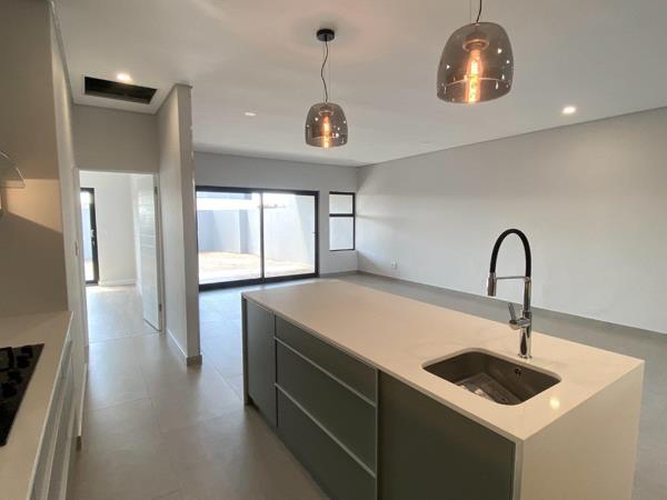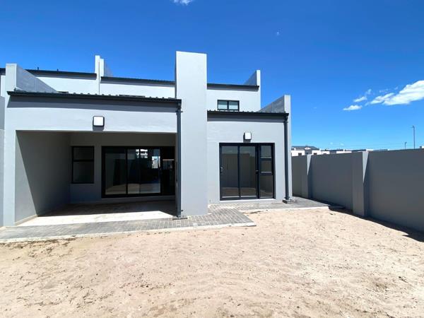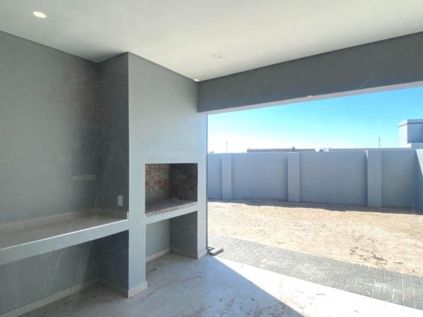 The open plan lounge and dining room area is spacious with a sliding door leading out to under cover braai patio and private garden with enough space for small pool as an optional extra and a double automated garage with direct access into the home