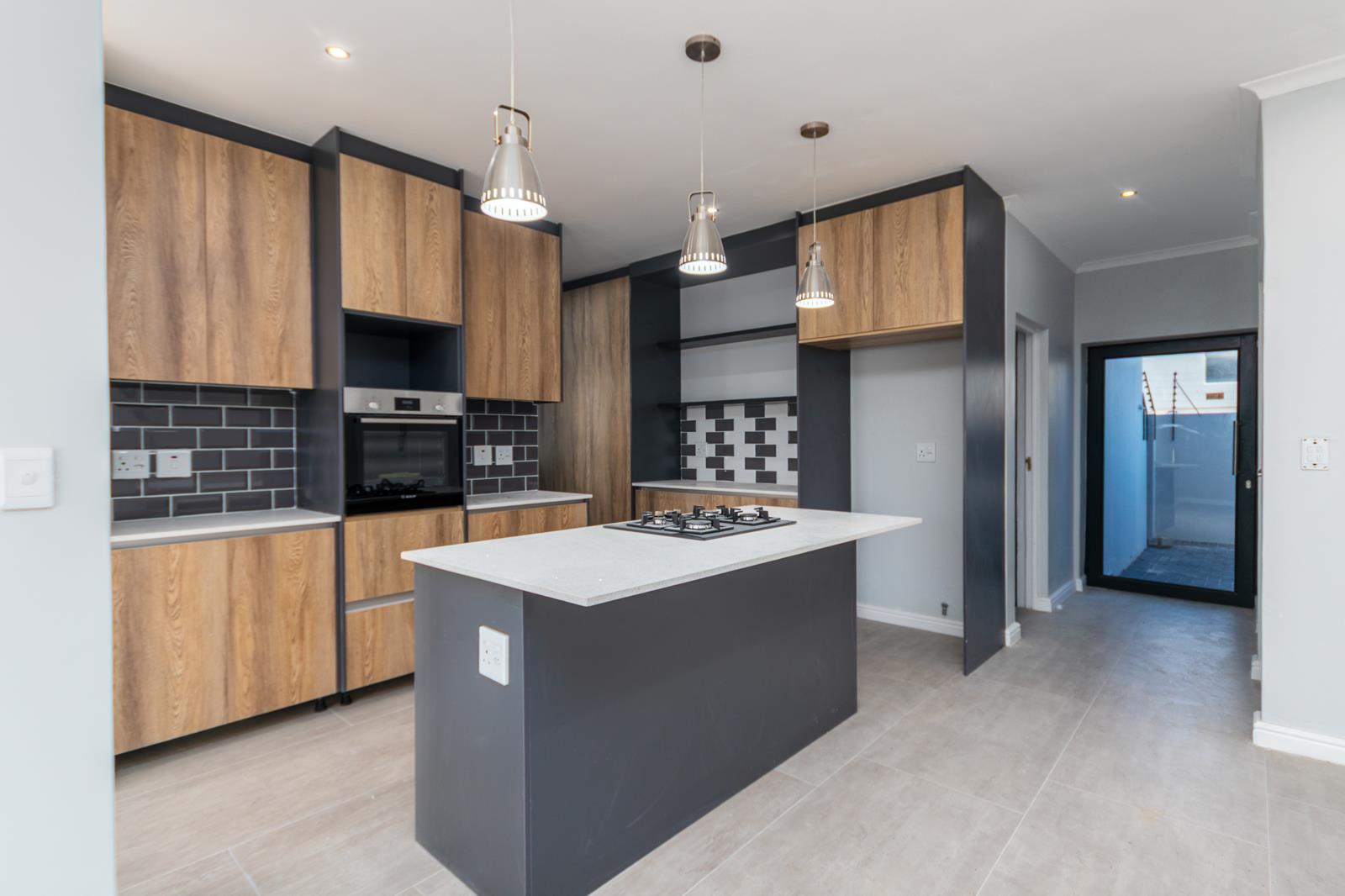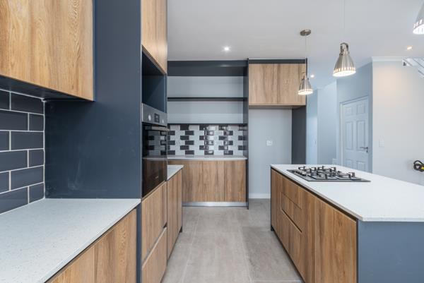 The ultra-modern kitchen is a showstopper, complete with a central island, ample top and bottom cabinetry, and a separate scullery fully plumbed for a dishwasher and washing machinemaking daily living effortless.