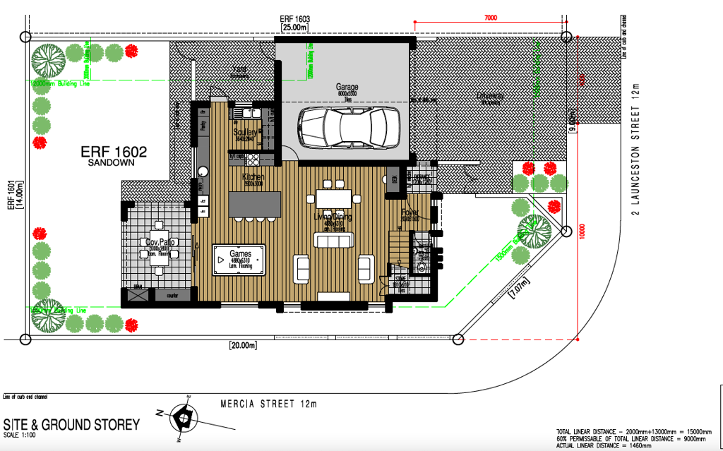 Downstairs, the open-plan layout showcases a spacious tiled living and dining area that flows seamlessly onto a covered patio with built-in braai, perfect for year-round entertaining. The designer kitchen, fitted with high-end finishes, includes a scullery and pantry for extra convenience. A separate guest toilet and a versatile games room or home office complete the ground level.
