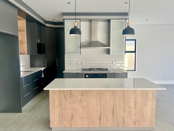 The heart of the home is a sleek designer kitchen featuring Caesarstone countertops, a gas hob, ample storage, and a separate scullery ideal for modern living and effortless hosting.