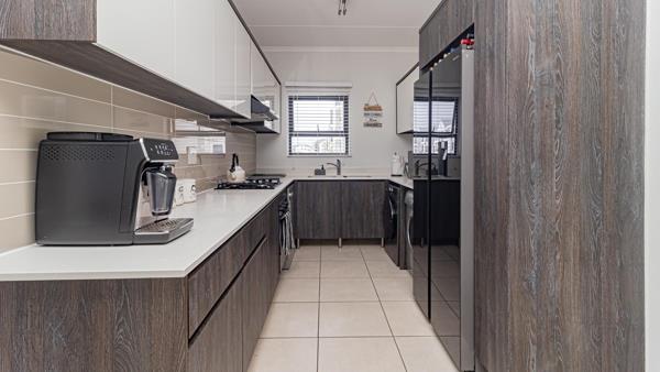The sleek, modern kitchen is a chefs delight with Caesarstone countertops, a stylish mix of wood and white high gloss cupboards, a gas hob & oven, and is FULLY KITTED with high-quality appliances including a Defy tumble dryer, washing machine, dishwasher, and a Hisense double door fridge.