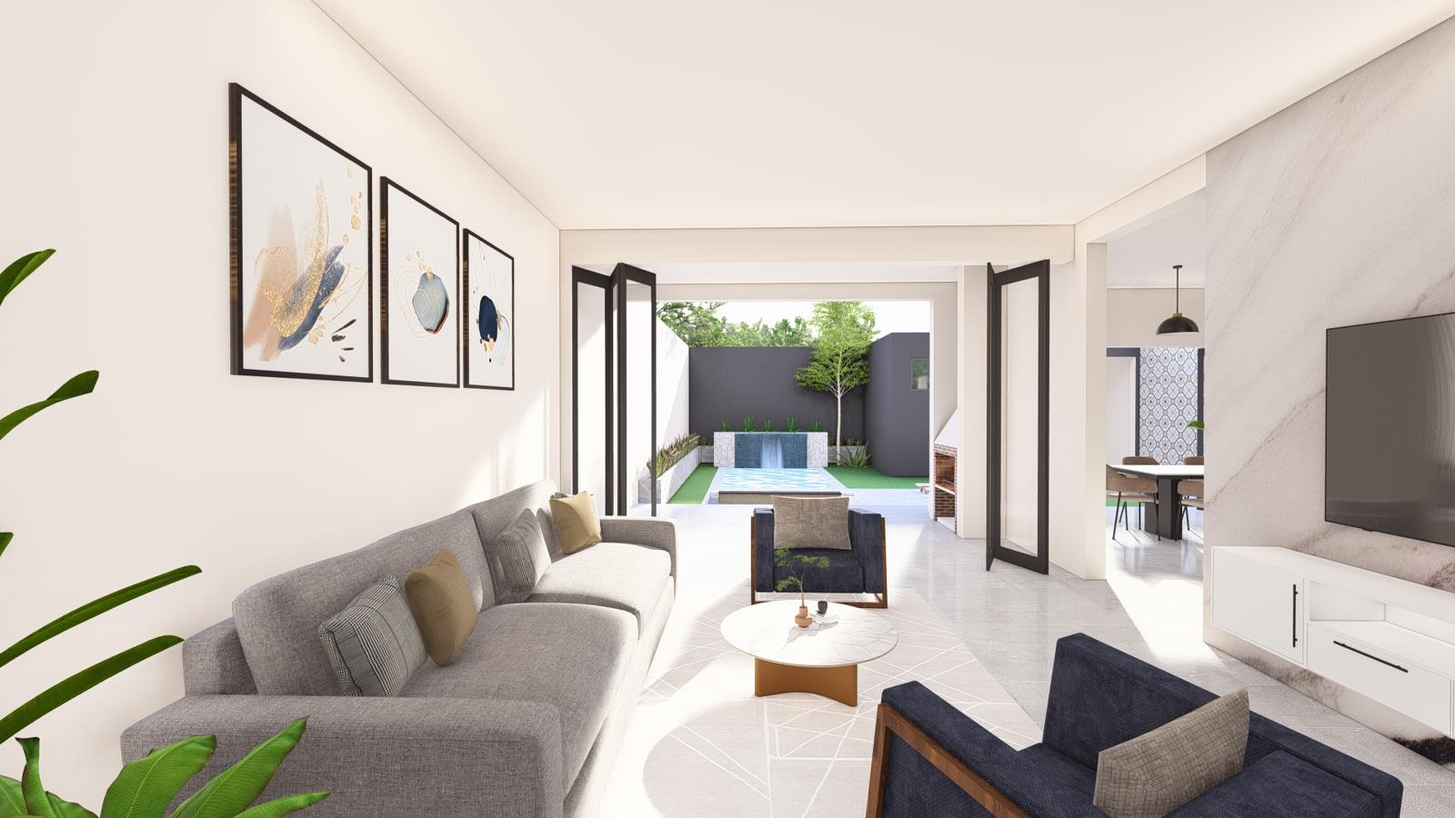 The open-plan interiors flow to a sparkling swimming pool, framed by clean lines & natural light.