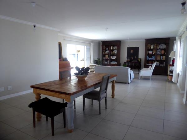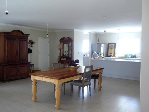 This single storey home offers loads of living and garden space. There is a huge open plan living area, which includes the entrance, lounge, dining room and open plan kitchen. If I say huge, I mean large. A ten seater dining room table fits comfortably, with tons of space to spare for a server, etc.