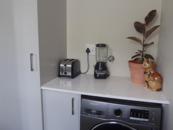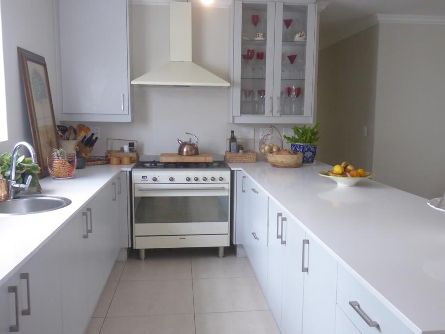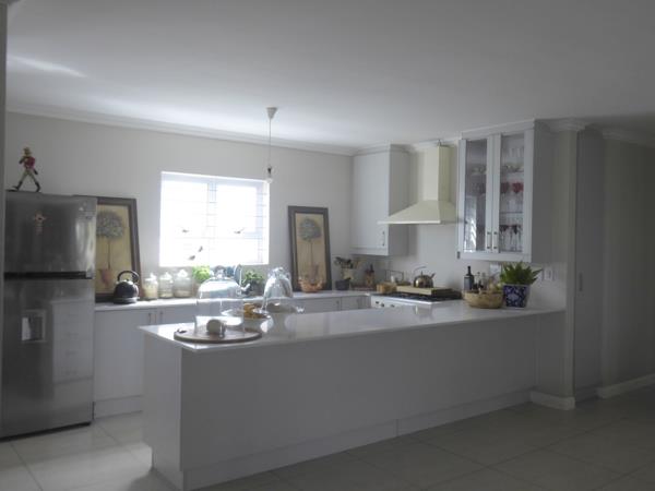 The kitchen is large with a cream Smeg Concerto stove which has a 5 burner gas hob and large electric oven and extractor fan. The kitchen counter facing the diningroom is three metres long. A seperate scullery leads directly to the garage. A second door leads to the garage from the dining area. Sliding doors opens to the covered braai patio with built in braai, and sunny north facing garden.