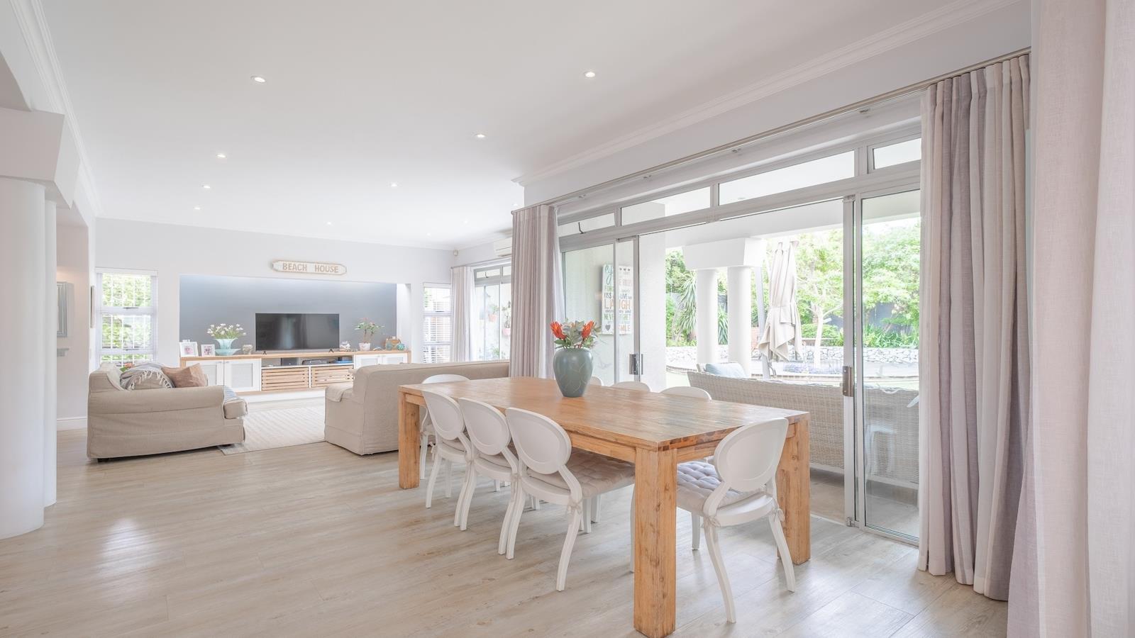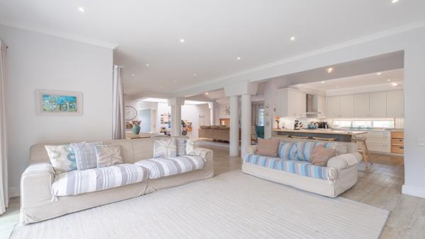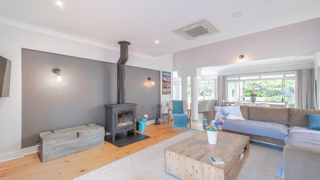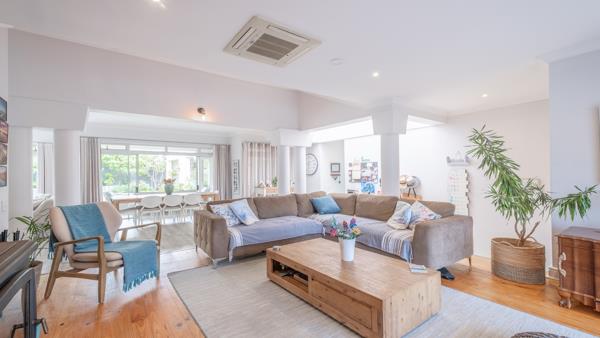 The expansive living area includes two lounges, a dining room, and a modern kitchen fitted with caesarstone counters, a 900mm Smeg gas stove, and a separate scullery and laundry. The living space is enhanced by a cozy wood-burning fireplace, air-conditioning, and doors that open to a lush, established garden perfect for family gatherings and outdoor relaxation.
