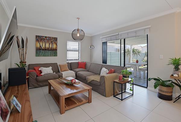 The living area opens to an undercover patio with a built-in braai, ideal for entertaining. The garden is beautifully maintained and designed for low maintenance, featuring artificial turf.