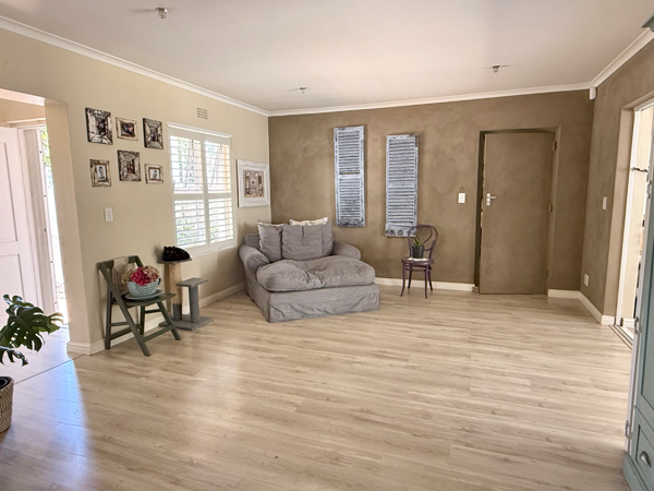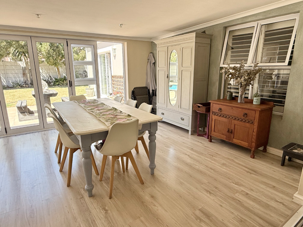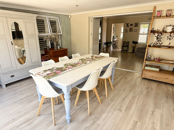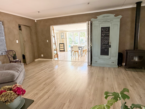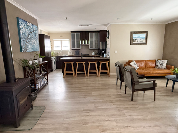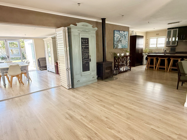 The interior boasts modern wood-look flooring that flows seamlessly through the spacious open-plan living areas. You''ll find a cozy lounge featuring a wood-burning fireplace, perfect for those cooler evenings, and plenty of natural light streaming in through windows fitted with stylish white shutters. The kitchen is a real hub, offering a large counter area with bar seating, making it ideal for casual meals or entertaining friends.