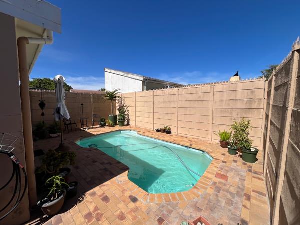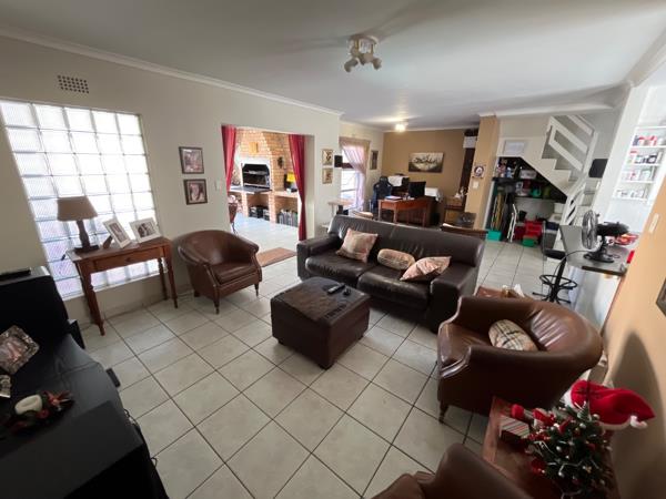 Outside, the property features a private garden, a refreshing swimming pool, and a built-in braai area. The paved driveway leads to a single garage, providing secure parking, with additional under cover parking available for 2 cars. Pets are welcome, and the property is totally walled, offering a secure environment. Enjoy scenic views from various points around the home.
