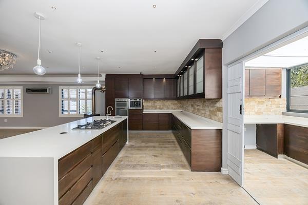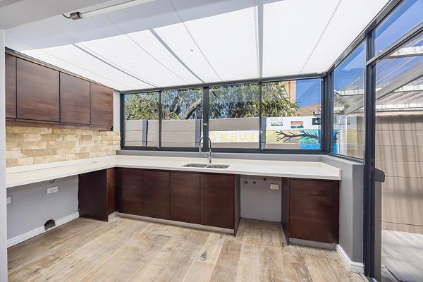 large plumbed fridge and built in wine cabinet. Step out into a skylight lit room behind the