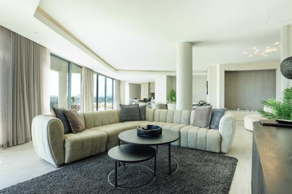 The penthouse features three expansive living areas, two kitchens, inviting balconies for lounging and stylish cocktail lounge with the cocktail bar to
