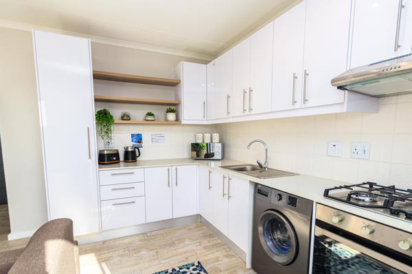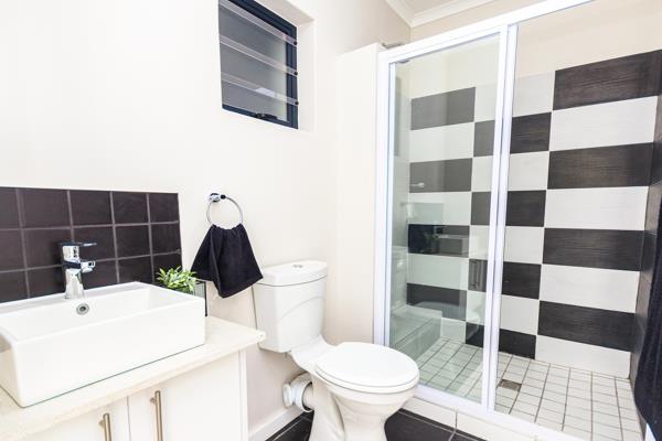 The two generously sized bedrooms are bright and airy, thanks to expansive windows that offer great views and a connection to the outdoors. The bathroom showcases a clean, modern style with premium fixtures, adding to the homes overall polished feel.