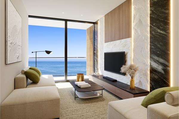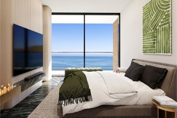Two well-appointed bedrooms provide ample space and built-in storage, with the master bedroom enjoying direct access to a private ensuite. Large windows flood the apartment with natural light, enhancing the contemporary design while offering stunning views of Robben Island, Table Mountain, and Bloubergstrand Beach.