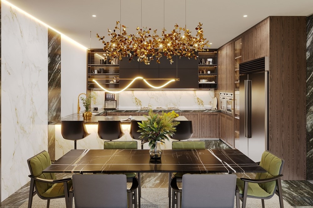 Designed for modern living with a luxurious touch, the Type H apartment offers a spacious open-plan layout that seamlessly integrates the living, dining, and kitchen areas. The kitchen features an elegant L-shaped design with a breakfast bar, making it both stylish and functional for entertaining or casual dining.