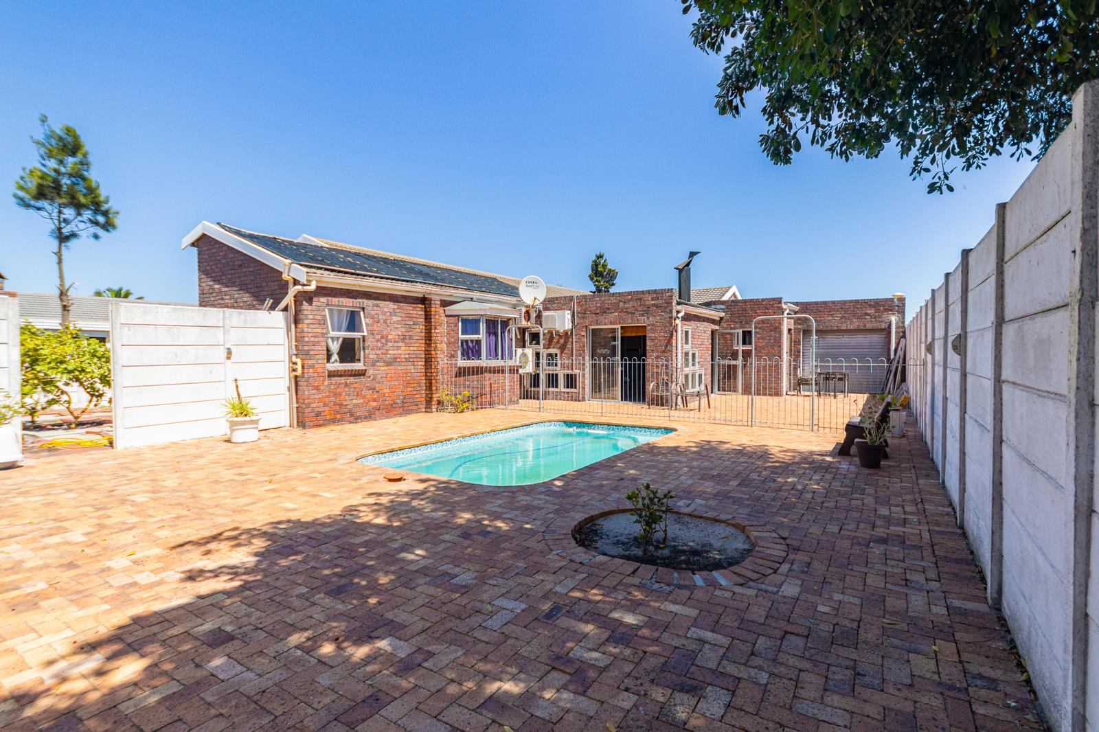 An enclosed braai and entertainment room creates a private gathering space for year-round use and overlooks the swimming pool. The low-maintenance garden ensures easy upkeep while still providing enjoyable outdoor space.