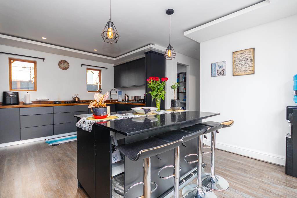 At the heart of the residence lies a designer kitchen that is both functional and breathtaking. Italian-imported Woodstock Gunmetal Birch FSC veneer cabinetry brings rich texture and sustainability, complemented by handcrafted Kiaat countertops from Rare Woods. Precision-crafted by JS Construction Analysts, this culinary space features a quartz sink and premium appliances including a Grundig 70cm Multi-Function Double Oven and a 900mm 5-plate Gas-on-Glass Hob.