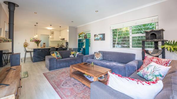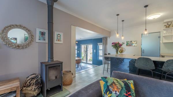 A lush, tropical-feel garden welcomes you at the gate. Inside, the open-plan layout flows from a central dining space into a modern kitchen with Caesarstone tops, hidden scullery, and laundry. The lounge connects seamlessly and opens out to a large undercover braai area protected from wind and weather where most of life happens. It all overlooks a landscaped garden and sparkling pool.