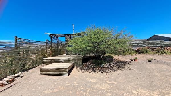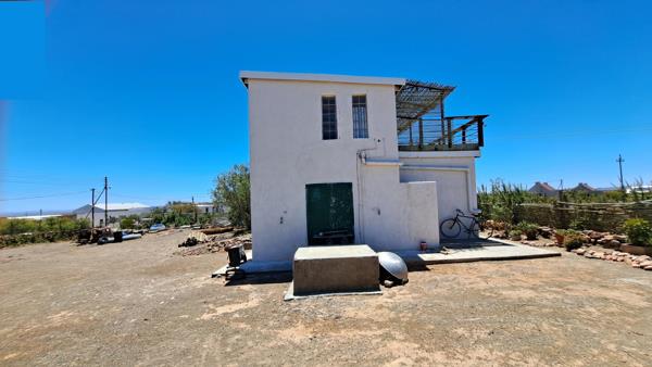 The double-story building features an open-plan area upstairs with newly installed wooden floors, a kitchen basin, working toilet, and a large, covered wooden deck offering panoramic 360-degree views of the Swartberg Mountain Range and the vast Karoo. Downstairs, you''ll find a spacious workshop area, a small room with a toilet, shower, and basin, as well as a single staff quarter with an additional toilet and shower. An enclosed caravan serves as a storeroom, and theres also an outside shower.