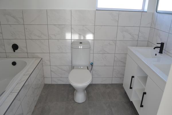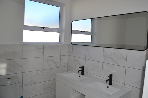 From the family area you get to the bedrooms, three bedrooms and two bathrooms. All bedrooms have built in cupboards, the main bedroom has ample cupboards. The main en-suite bathroom has beautiful finishes, black and white, how stunning, with a shower, toilet and basin.