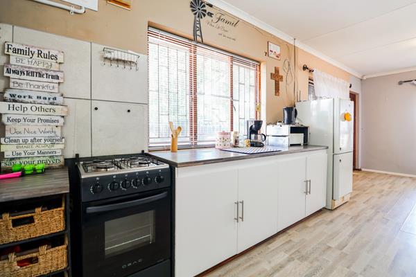 3 Bedrooms, 2 bathrooms, one with bath and the other with shower and guest toilet, loungeBraai room, kitchen, and dining room. The stove is not included. Solar Panels on the roof and batteries. Manageable garden and pets allowed. The house is within walking distance from the school and other amenities.
