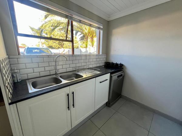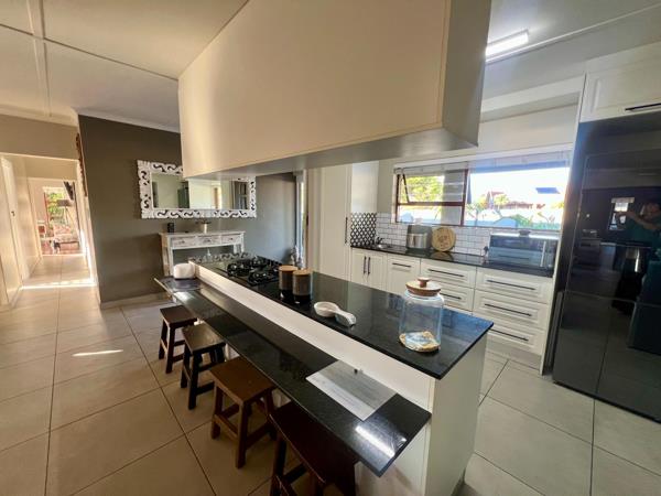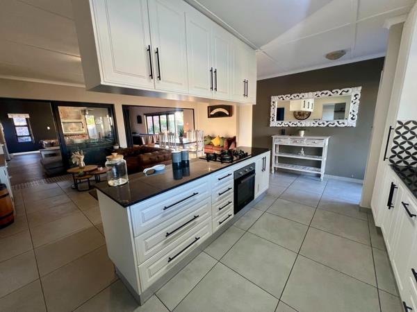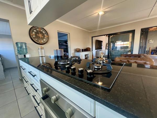 At the heart of the home is a stylish open-plan kitchen, thoughtfully designed with granite countertops, a built-in oven, a gas hob, and ample cupboard space. A central island creates the perfect gathering point for family and friends, while a separate scullerylaundry room with additional built-in cupboards keeps the main kitchen space neat and functional.