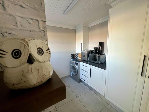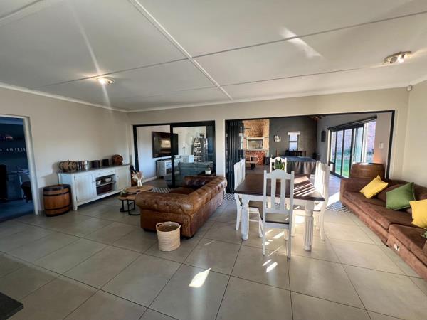 The kitchen flows effortlessly into the spacious lounge and dining areas, creating a warm and inviting atmosphere filled with natural light. This open-plan design continues into the enclosed braai room, complete with a built-in braai and stacker doors that open up beautifully to the outdoor spaceallowing for easy entertaining in all seasons.